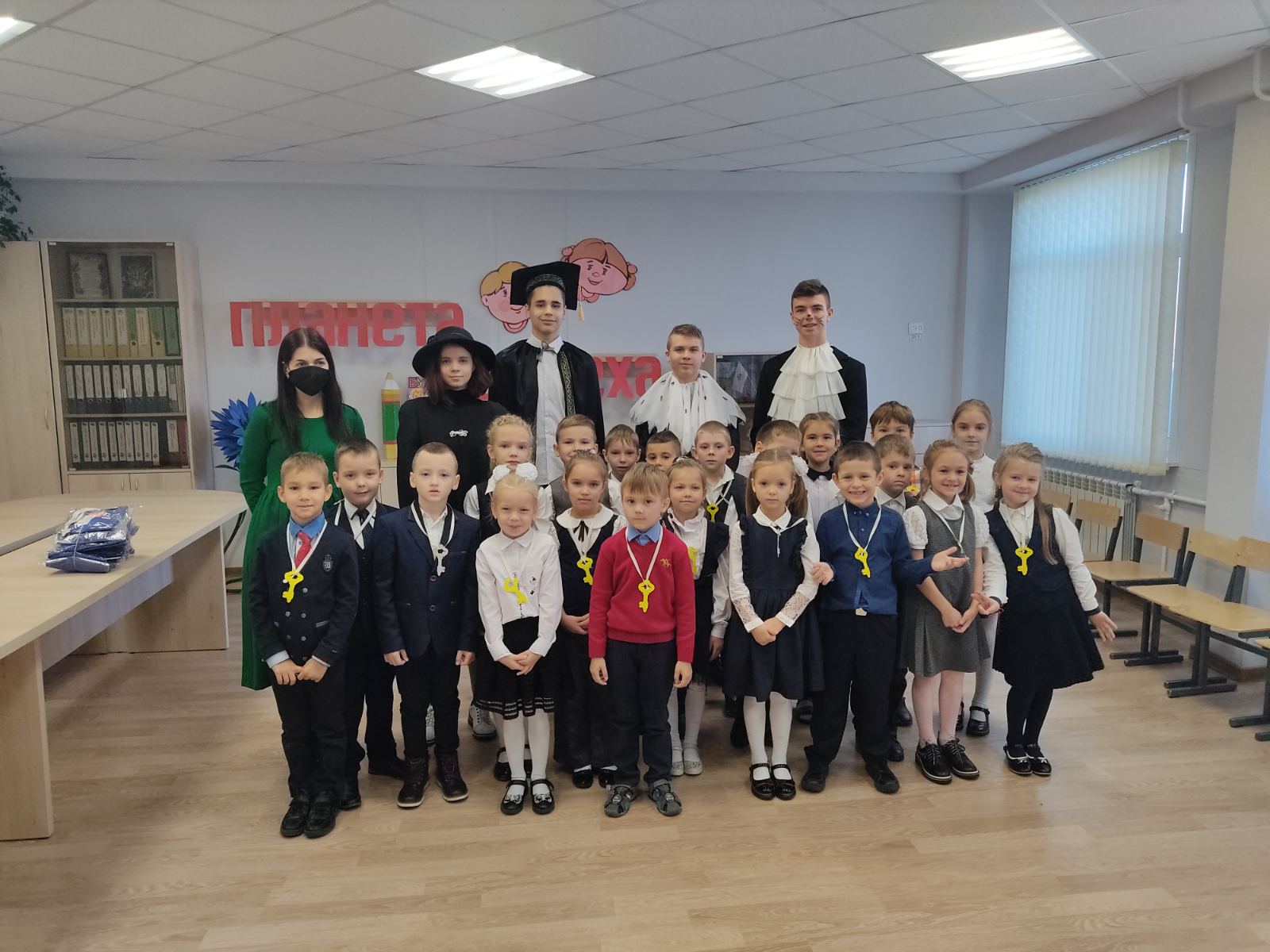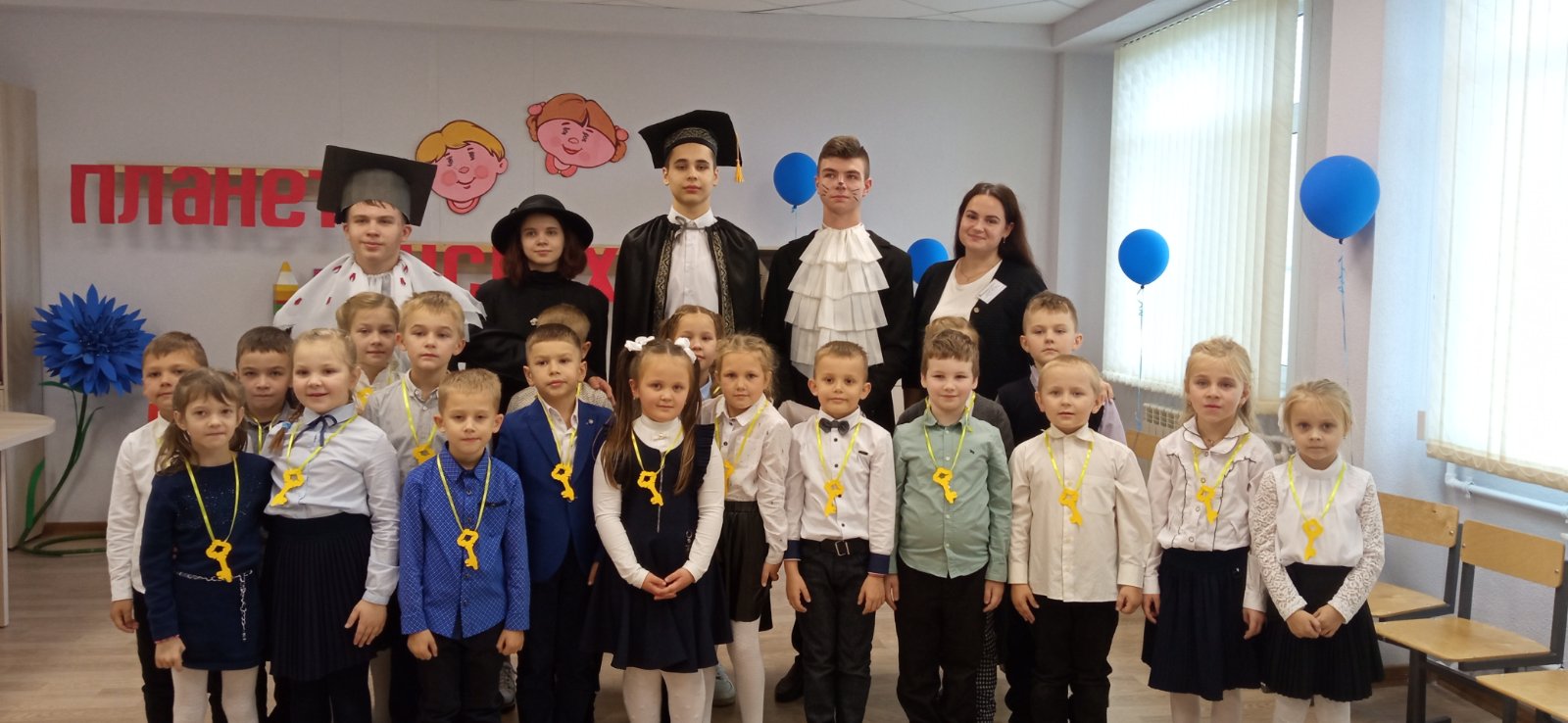 В завершении Магистр наук озвучил обещание первоклассника. Ребятам помазали руки мелом и вручили волшебные ключики в страну Знаний.