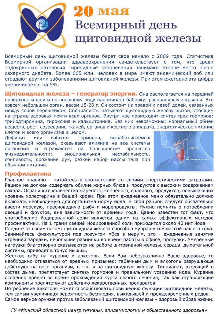 Главная Новости НовостиШкола — территория здоровья 20 мая — всемирный день заболеваний щитовидной железы 17.05.2018